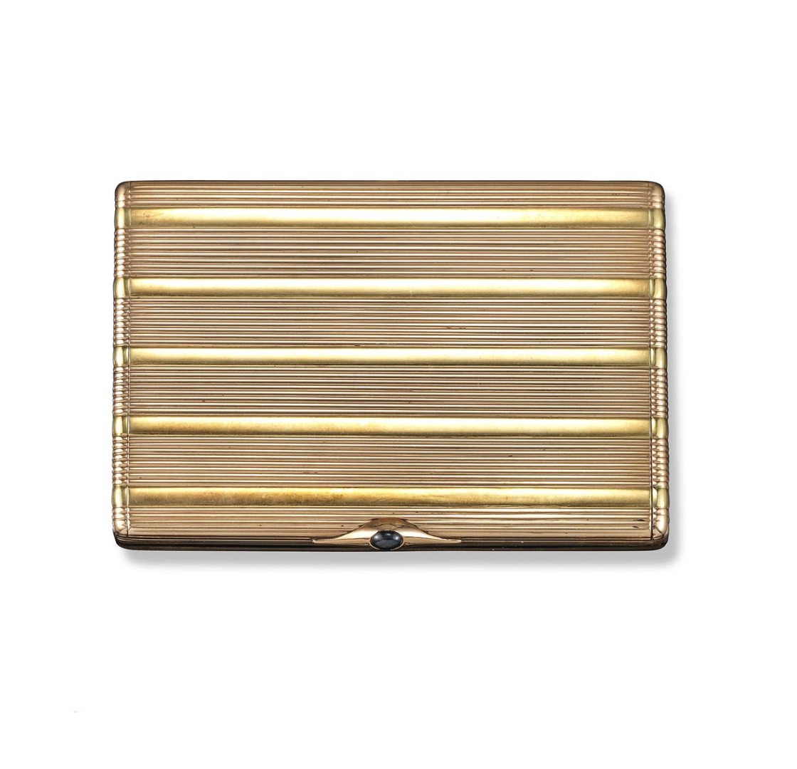 A Russian two-colour gold cigarette case, the strips of finely fluted pink gold extend over the entire exterior and are separated with plain yellow gold bands. The colour pattern extends to the polished interior. Cabochon sapphire thumbpiece. Engraved inside the lid 'Ursula 28.3.1940'.