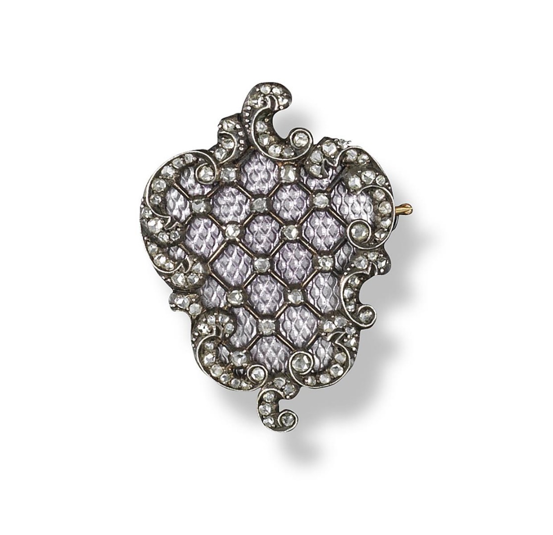 A gold and enamel brooch by Fabergé, the abstract design applied with mauve guilloche enamel and diamond-set lattice within scrolling diamond borders, in silver and gold. Signed ФАБЕРЖЕ, with maker's mark МП for Michael Perchin. 3.2cm high.