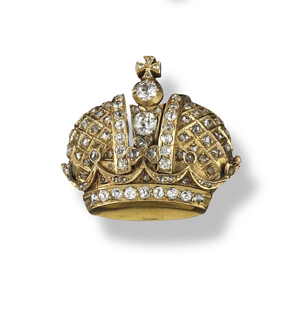 A diamond-set crown brooch possibly by Fabergé, the gold Imperial Crown of Russia is set with graduated old circular cut diamonds and rose cut diamonds. Indistinct mark on pin, probably A.H. With further marks to the catch including КФ. 2.5cm wide.