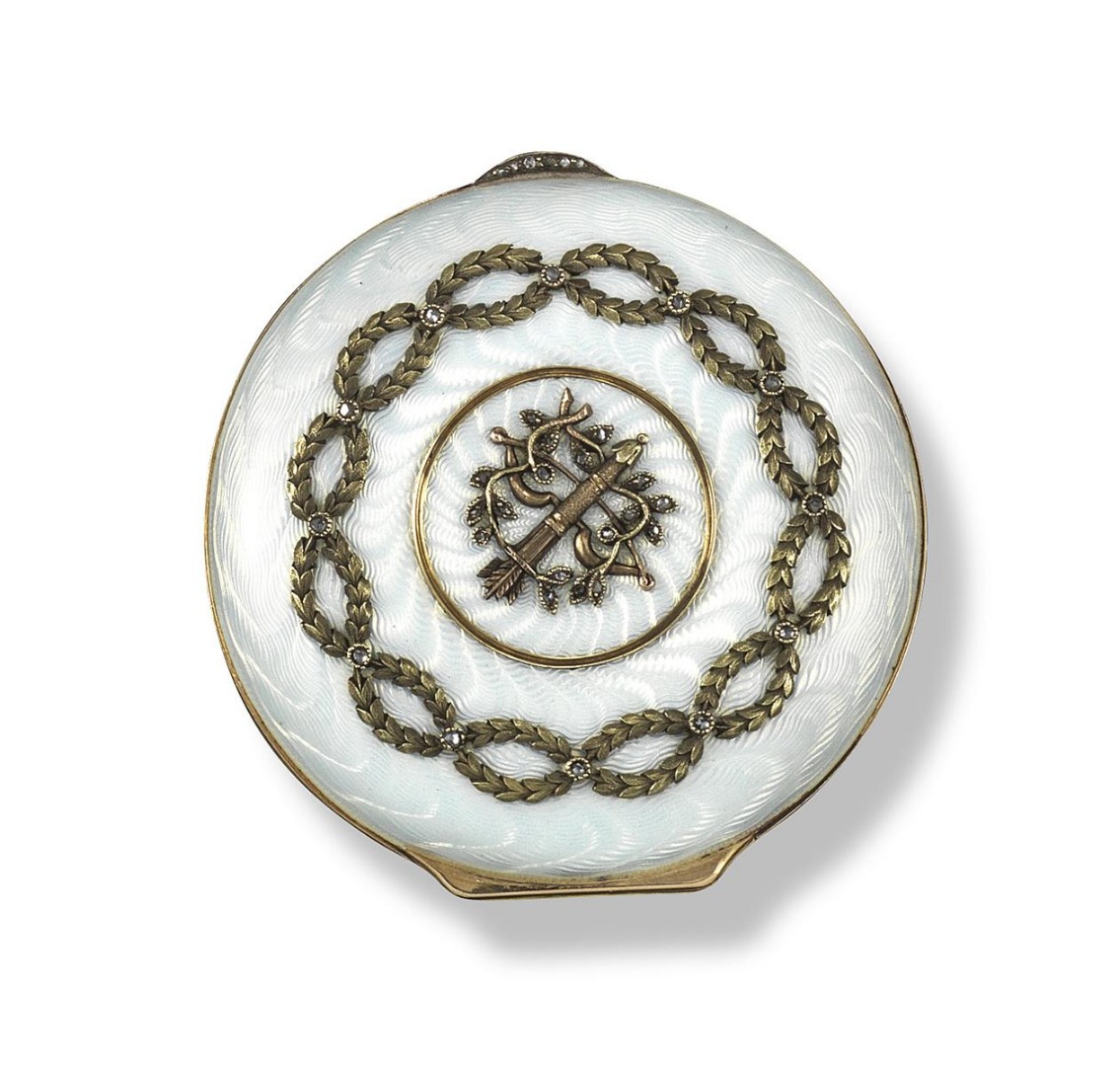 A 19th century circular gold box, decorated with oyster coloured guilloche enamel and centred with a diamond-set bow and quiver romantic trophy, within entwined laurel border. 4.5cm diameter.
