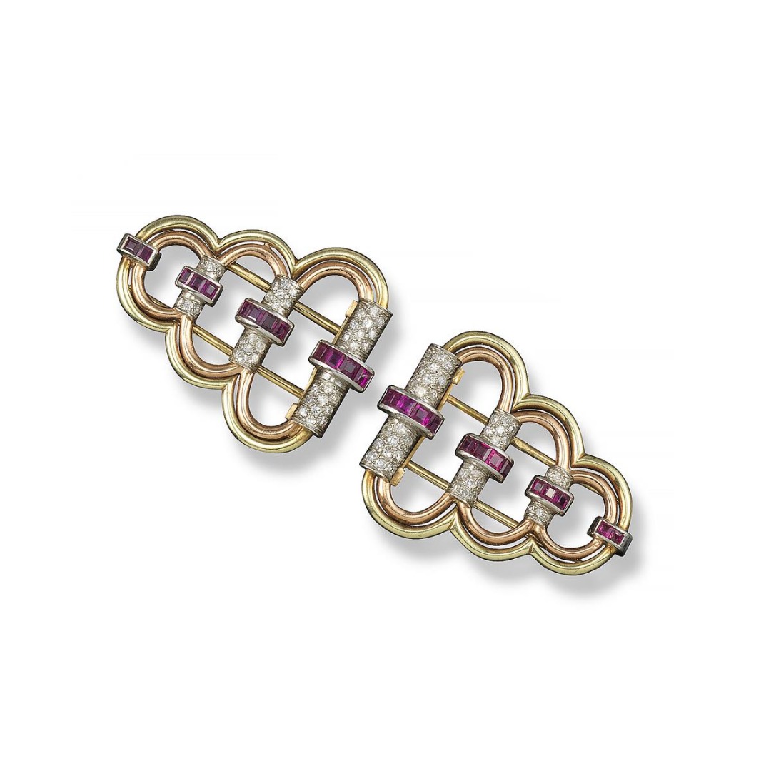 A pair of diamond and ruby-set three colour gold clip brooches by Cartier