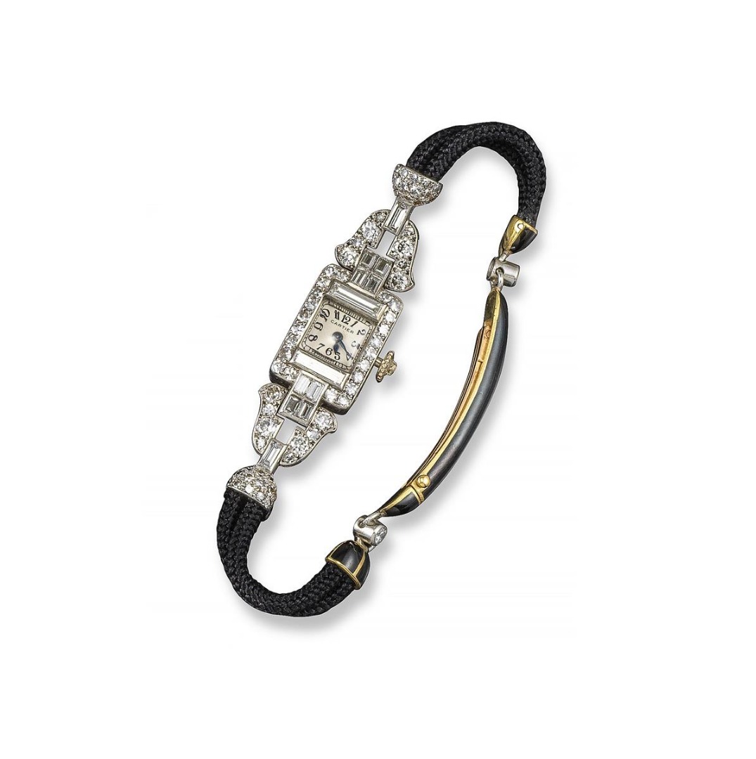 An Art Deco diamond wristwatch by Cartier, the rectangular signed cream dial, with black Arabic numerals, the case set with circular and baguette-shaped diamonds within palmette-style lugs and further pave-set diamond caps. On black cord band and with enamel and diamond-set clasp. Cartier box.