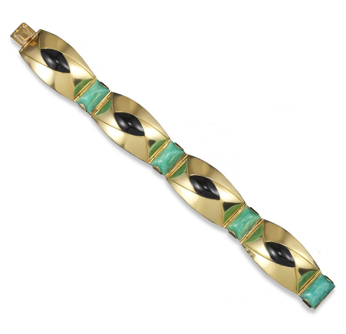 A gold, enamel and amazonite bracelet by Lacloche Frères, the four tonneau-shaped sections designed with a central black enamel lozenge within triangular gold folds, alternately-set with sugarloaf amazonites in yellow gold. Signed Lacloche Frères Paris and with French control marks. 19cm long.