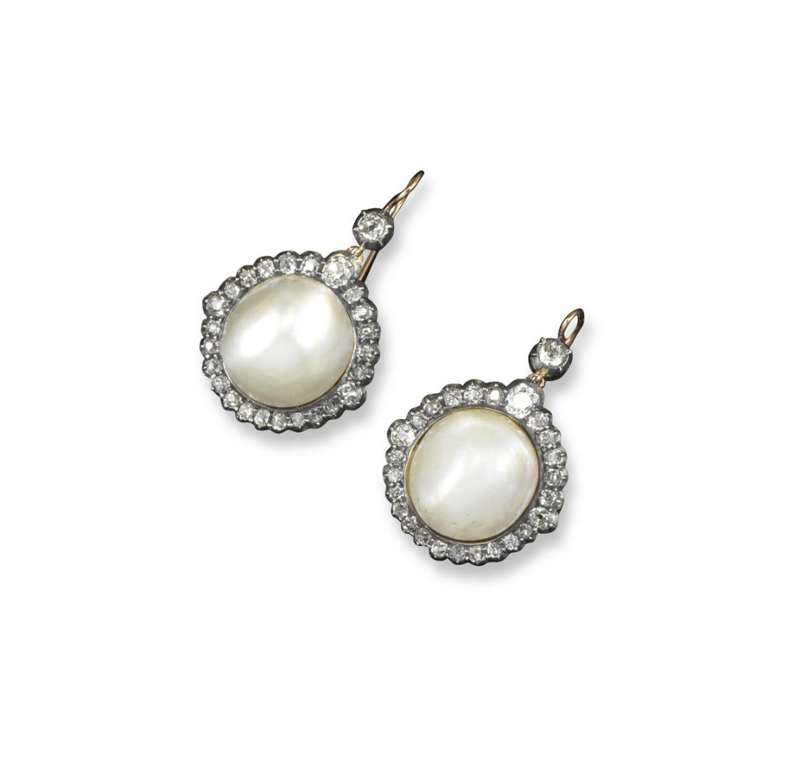 A pair of natural saltwater blister pearl and diamond earrings, the large blister pearls are set within a surround of cushion-shaped diamonds and suspend from a further diamond in silver and gold closed back settings. 2.5cm wide.