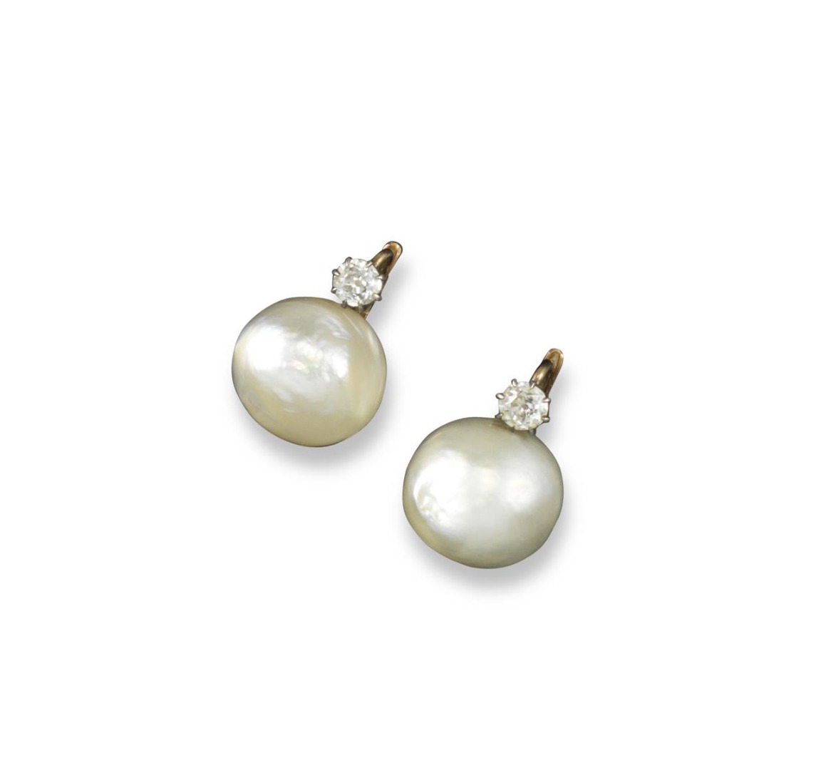 A pair of natural pearl and diamond earrings, the large natural pearls weigh 15ct (60 grains) and 13ct (52 grains) and are set below and old cushion-shaped diamond in silver and gold. French control marks.