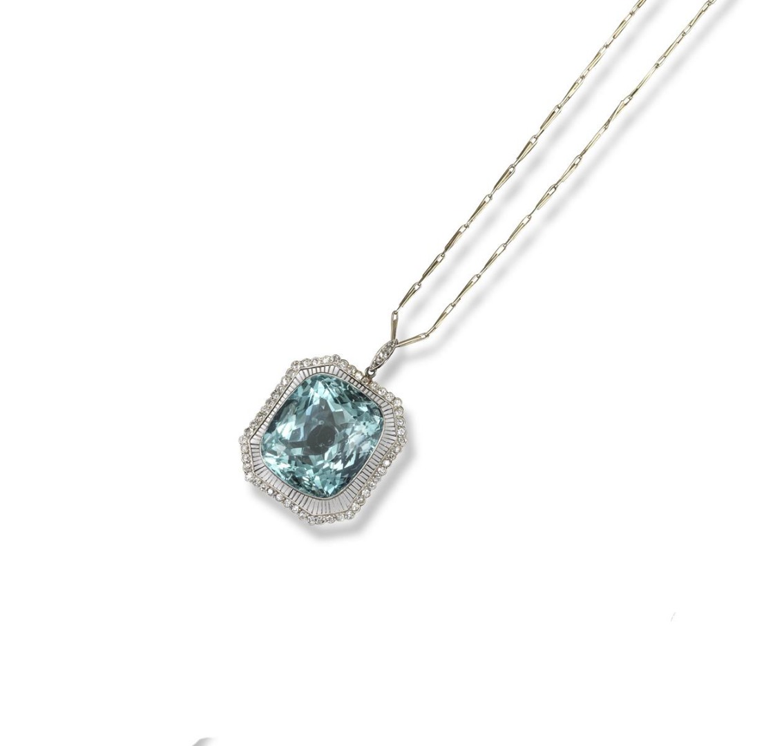 An early 20th century large aquamarine mounted pendant, the cushion-shaped aquamarine weighs approximately 46.00cts with a pierced millegrain-set diamond surround. On fine-link white gold neck chain. With screwdriver and fitting for brooch conversion. Fitted case.