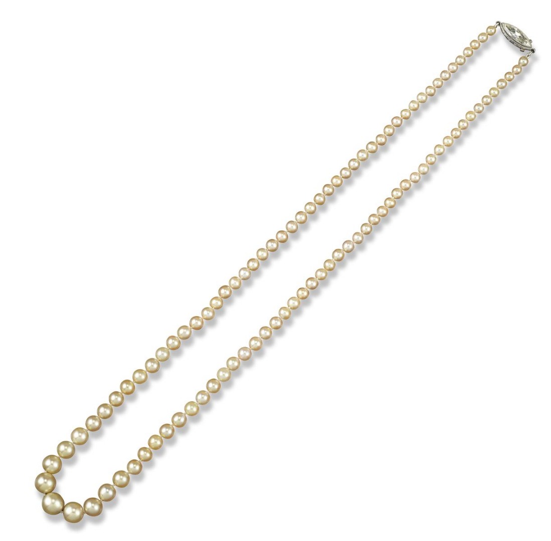 A single row natural saltwater pearl necklace, the pearls graduate from 3.80 to 8.55mm. With a marquise-shaped diamond clasp, the diamond weighs approximately 0.90cts. 55cm long.
