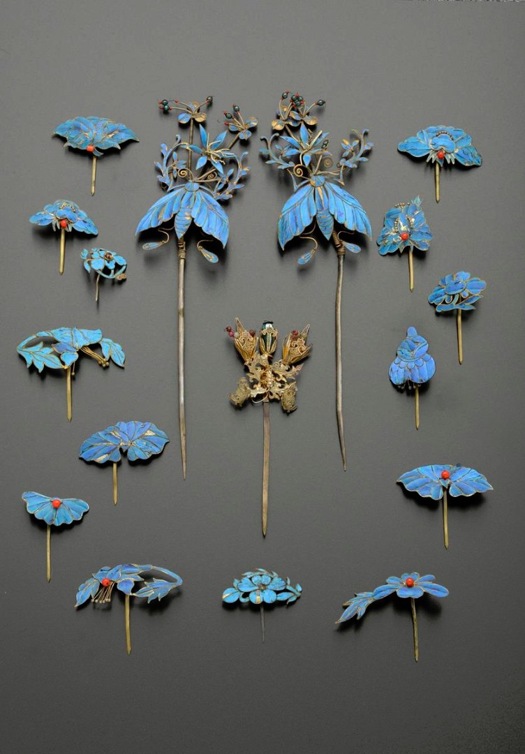 A COLLECTION OF CHINESE GILT METAL AND KINGFISHER FEATHER HAIR ORNAMENTS