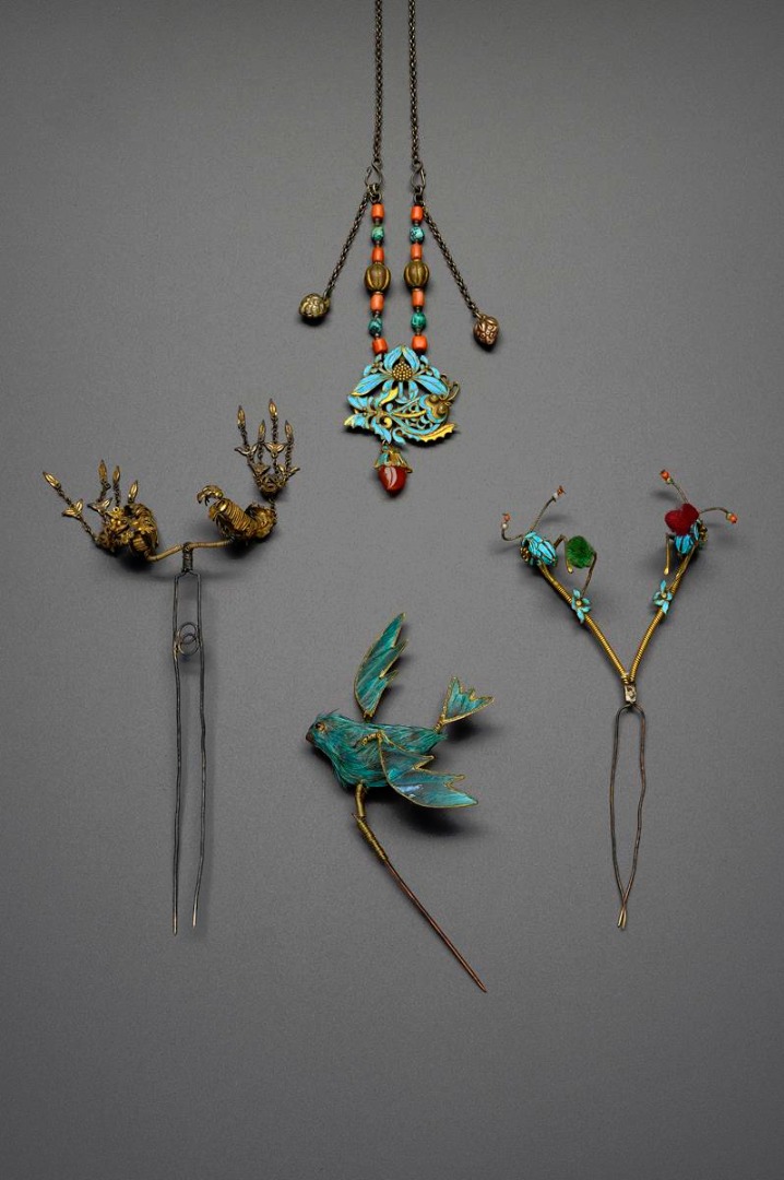 Modelled as a fish beneath a lotus flower, supporting a peach-shaped agate bead, the chain with red and turquoise beads, together with two hair ornaments, one depicting two crickets, the other a pair of articulated Buddhist lion dogs with brocade balls, and a model of a bird, 32.5cm max. (4)
