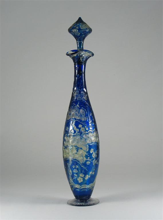 A good Stourbridge intaglio-cut blue-flashed decanter and stopper, probably designed by Joshua Hodgetts for Stevens & Williams, the slender ovoid body decorated with prunus and pine trees, and raised on a star-cut circular base, c.1910, 44.5cm. (2)