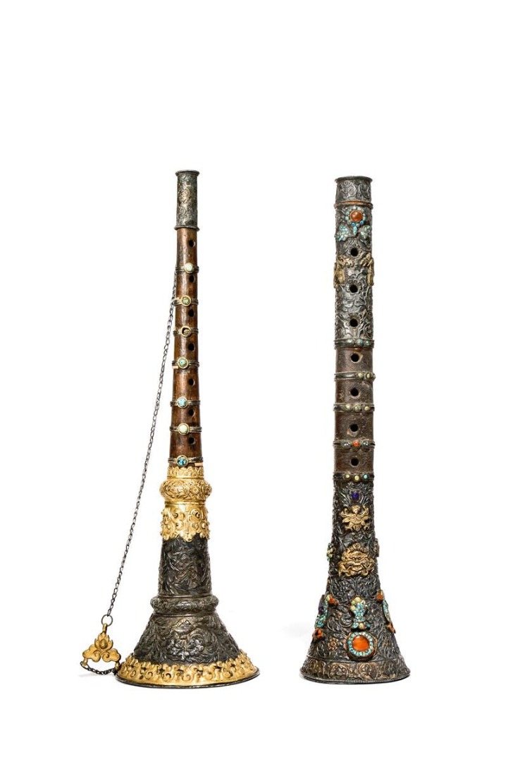 The oboe-like instruments decorated in relief in gilt metal with foliate designs, Buddhist emblems, dragons and birds, each cylindrical flared body with seven air holes divided by concentric bands, inlaid with glass and coloured stones, one with a suspension chain, 47cm. (2)