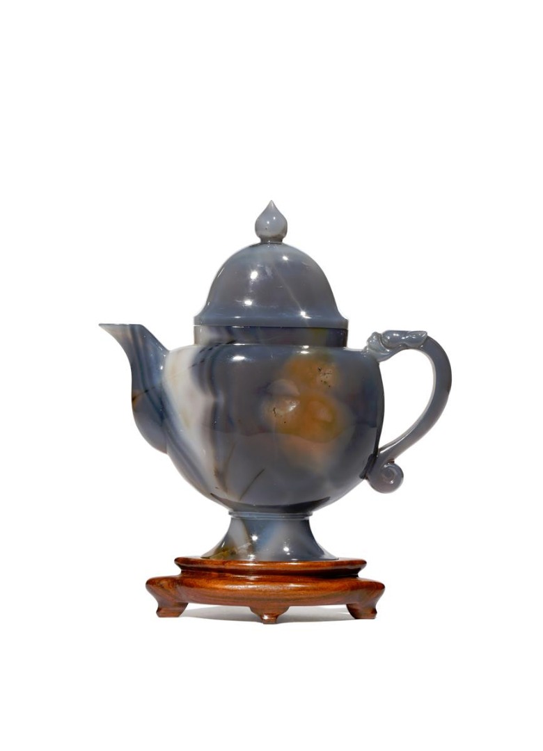 A CHINESE AGATE EWER AND COVER LATE QING DYNASTY The flattened ovoid body raised on a flaring foot