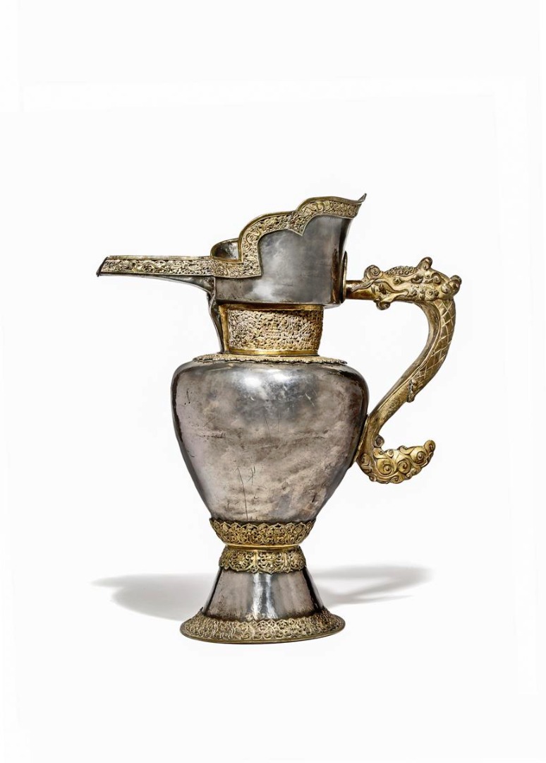 A MASSIVE TIBETAN PARCEL-GILT SILVER MONK'S CAP EWER
