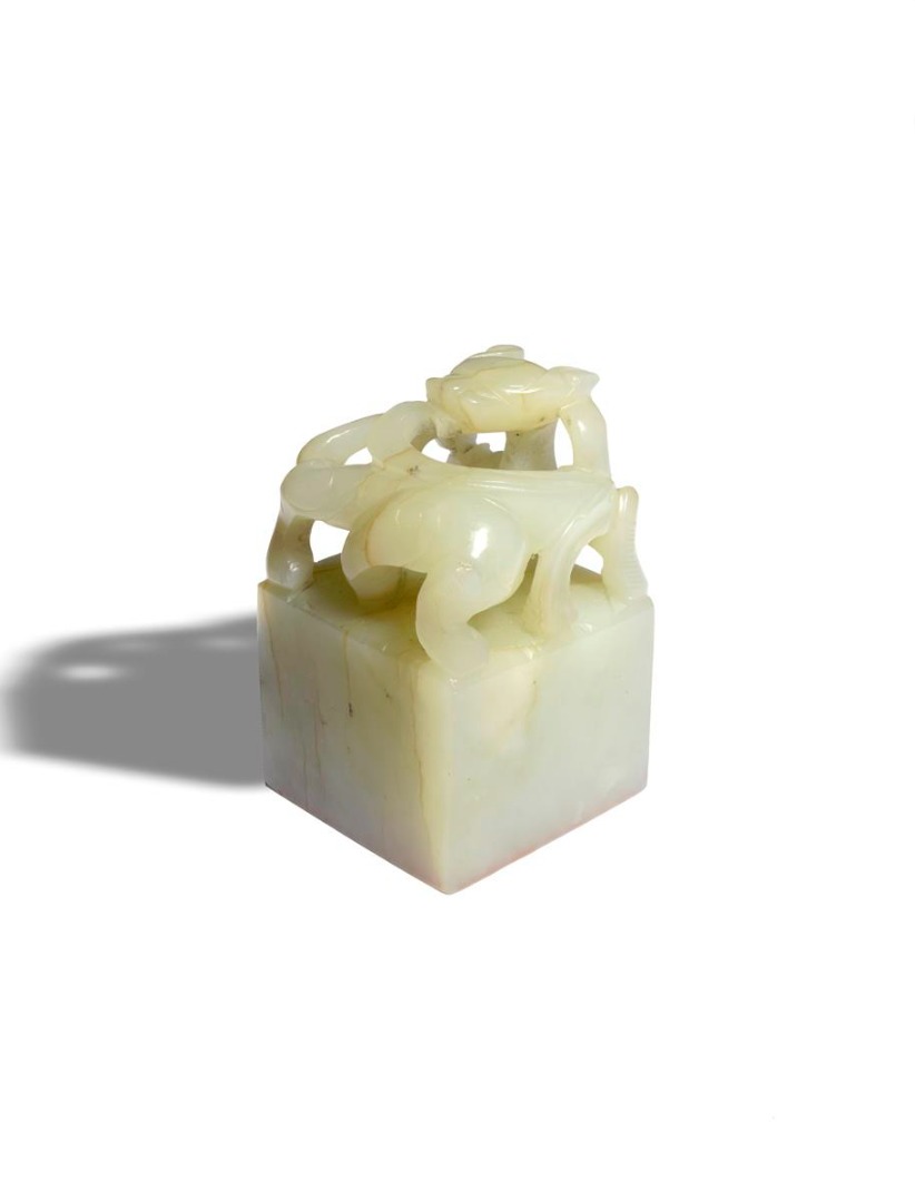 A SMALL CHINESE PALE CELADON JADE SEAL QING DYNASTY The square base surmounted by a sinuous...