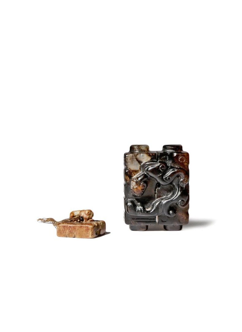 Carved to one side with a sinuous chilong, the vases with rectangular-section designs, and a miniature jade four character seal, the stones in celadon, grey and russet-brown, 3.8cm max. (2)