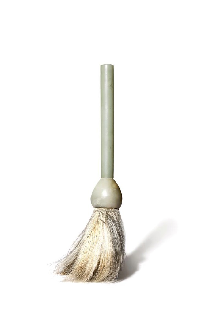 The cylindrical handle with a bulbous terminal and with horse hair bristles, the box with paper labels for the Sze Yuan Tang collection, the jade 13.5cm, 21.5cm overall. (2)