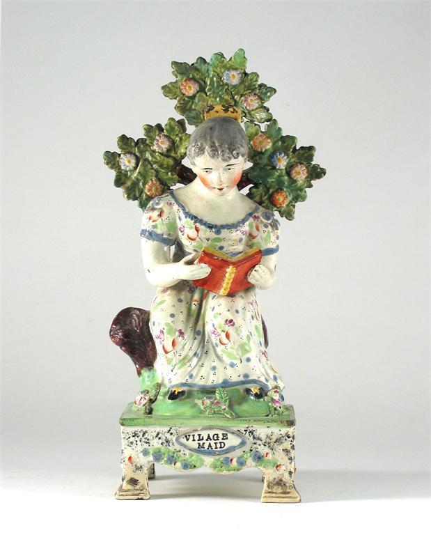 A Staffordshire pearlware model of a girl, sitting reading beneath a tree, the table base inscribed ' Vilage Maid', 19th century. Some restoration. 30cm.