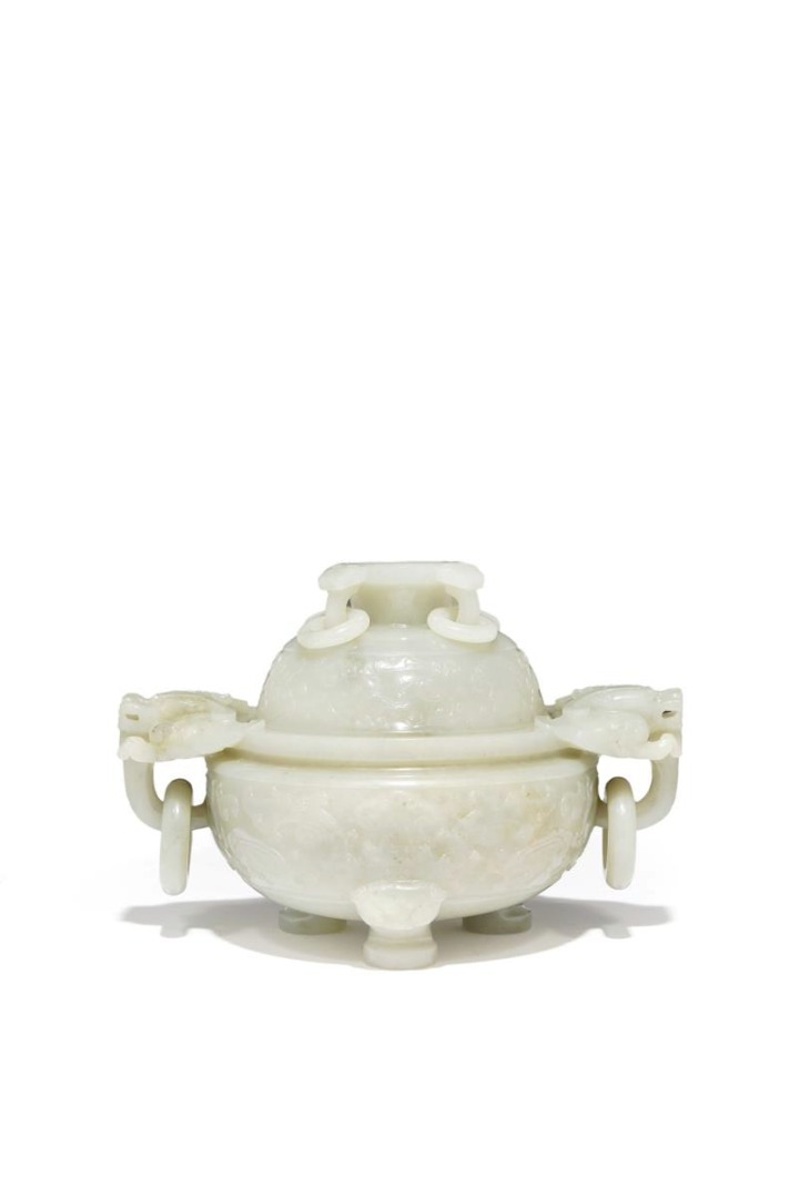A CHINESE PALE CELADON JADE TRIPOD INCENSE BURNER AND COVER QING DYNASTY The compressed circular...