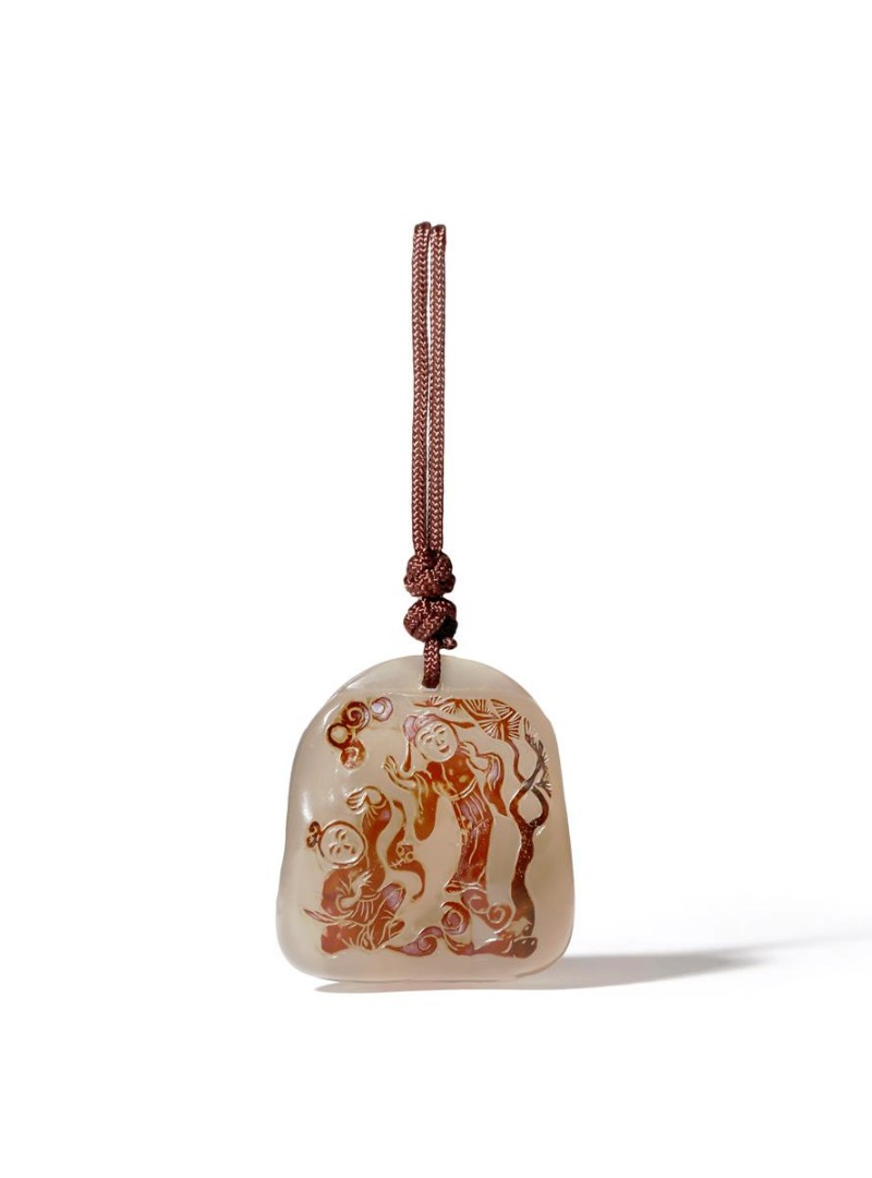 A SMALL CHINESE AGATE PENDANT QING DYNASTY Carved in shallow relief with two children at play...