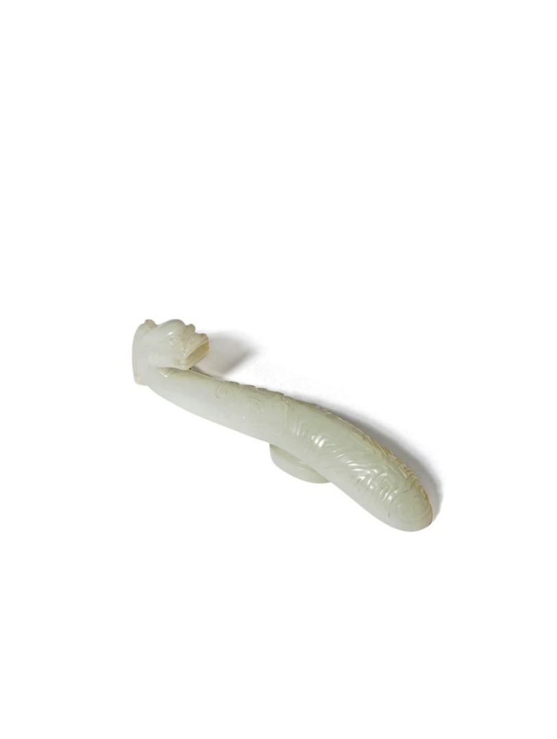 A GOOD CHINESE WHITE JADE BELTHOOK QIANLONG 1736-95 The shaft decorated in shallow relief with...