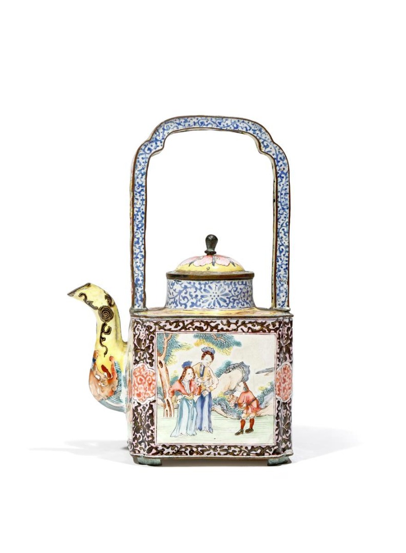 *A CHINESE CANTON ENAMEL FAMILLE ROSE TEAPOT AND COVER QIANLONG 1736-95 The rectangular body with...