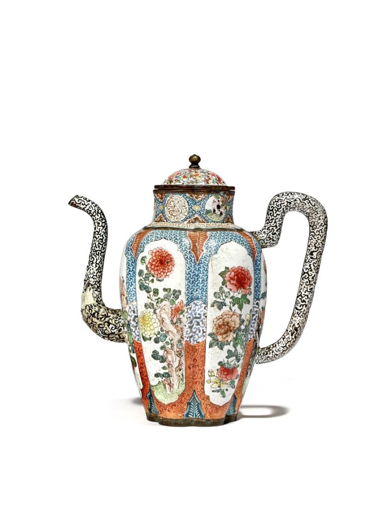 *A CHINESE CANTON ENAMEL FAMILLE ROSE TEAPOT AND COVER 18TH CENTURY The lobed body decorated with...