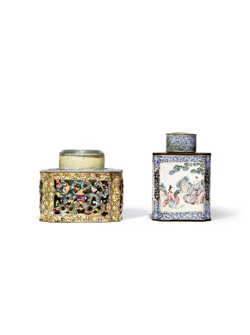 *A SMALL CHINESE CANTON ENAMEL FAMILLE ROSE TEA CANISTER AND COVER QIANLONG C.1780 Decorated with...