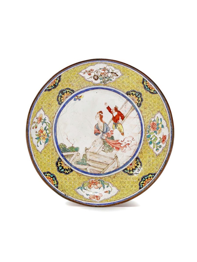 Painted with a circular panel depicting a European subject of a lady and an attendant looking at a butterfly on a terrace, the wide rim with shaped foliate panels reserved on a bright yellow cell ground, the reverse with prunus, peony and bamboo, the rim with a ruby ground, 21.5cm.