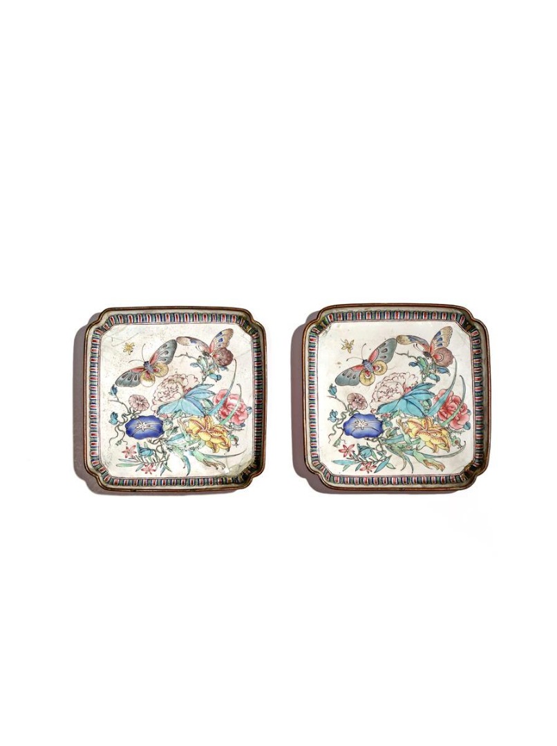 *A RARE PAIR OF CHINESE CANTON ENAMEL FAMILLE ROSE TRAYS YONGZHENG/QIANLONG Each delicately...