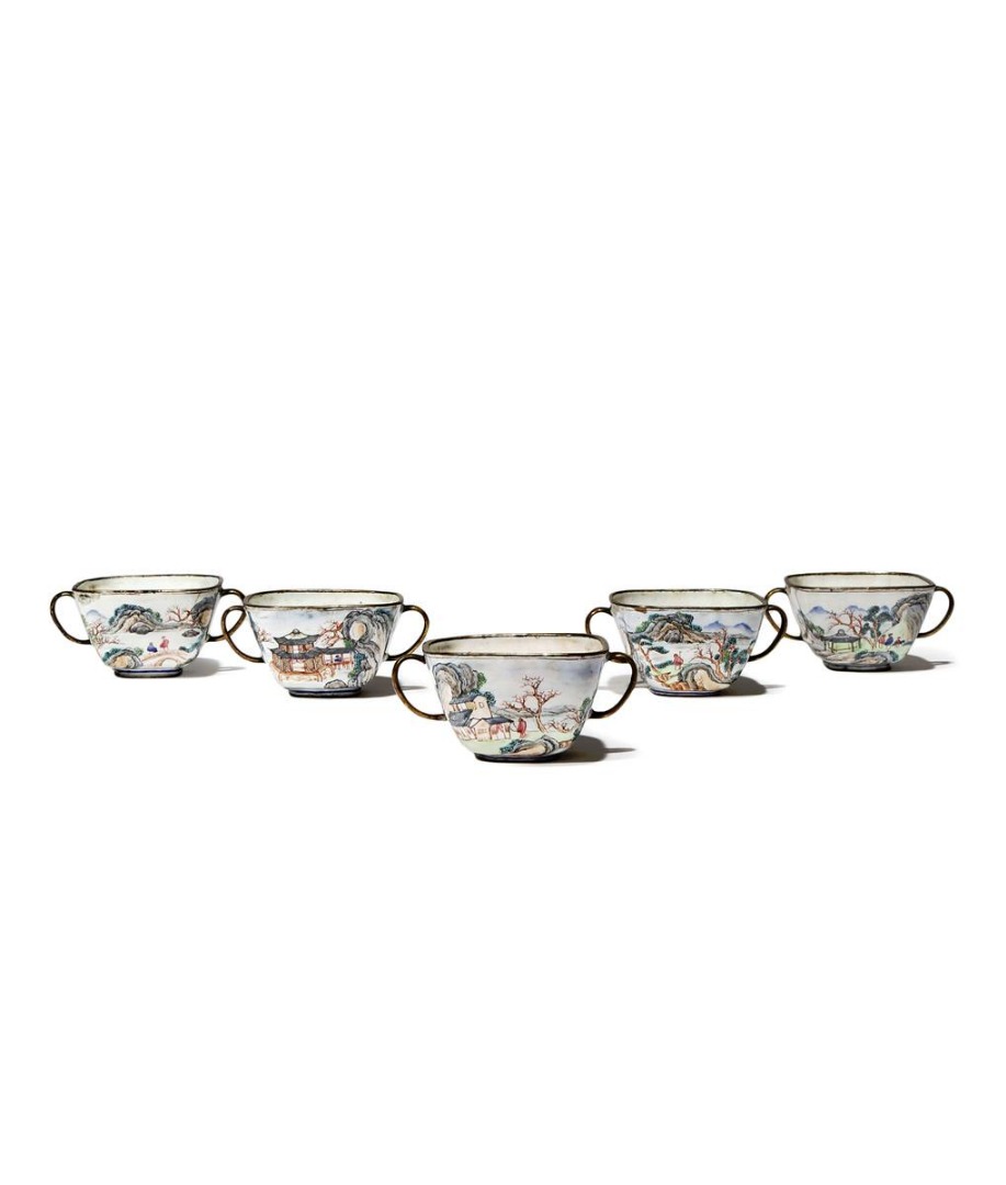 *A SET OF FIVE SMALL CHINESE CANTON ENAMEL FAMILLE ROSE TWO-HANDLED CUPS QIANLONG 1736-95...