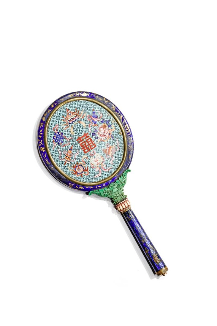 A CHINESE ENAMEL AND IVORY-MOUNTED MIRROR 19TH CENTURY The oval mirror with a blue enamel frame...