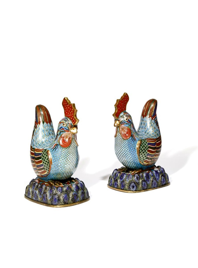 A PAIR OF CHINESE CLOISONNE MODELS OF CHICKENS LATE QING DYNASTY Each crouching on a rocky base