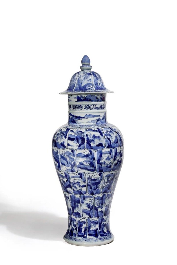 The tapering body decorated with many panels, variously depicting rocky mountainous scenes with willow, pine and small dwellings, the neck with two raised bands dividing foliate and landscape designs, the domed cover with a scalloped rim, painted with six triangular landscape cartouches, 60.5cm. (2)