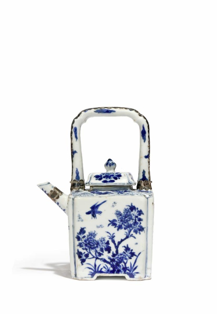 A CHINESE BLUE AND WHITE WINE POT AND COVER KANGXI 1662-1722 The tapering square-section body...
