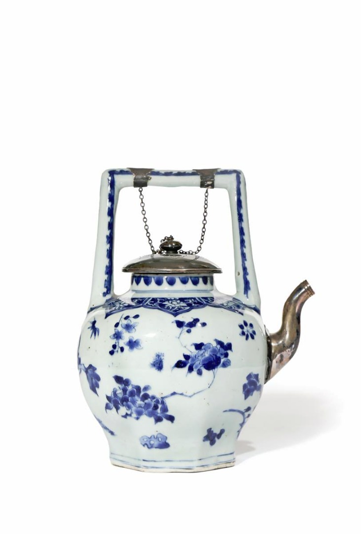 A CHINESE BLUE AND WHITE EWER C.1640 With an octagonal base and a straight bail handle