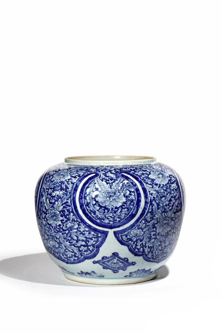 A LARGE CHINESE BLUE AND WHITE OVOID VASE KANGXI 1662-1722 The compressed circular body painted...