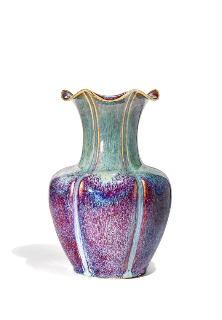 A CHINESE FLAMBE GLAZED VASE QING DYNASTY The lobed ovoid body rising to a flaring fluted neckrim