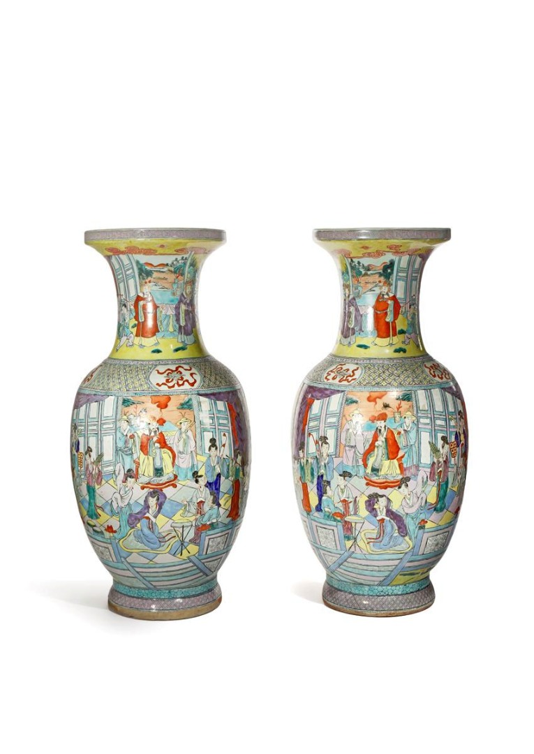 Painted in mirror image with continuous scenes depicting a band of musicians entertaining a seated official on a terrace, with plantain and maple in a fenced rocky garden beyond, bordered by bands of key fret and scroll designs, the shoulder with panels containing auspicious objects and ribbons on a cell diaper ground, 79.5cm. (2)
