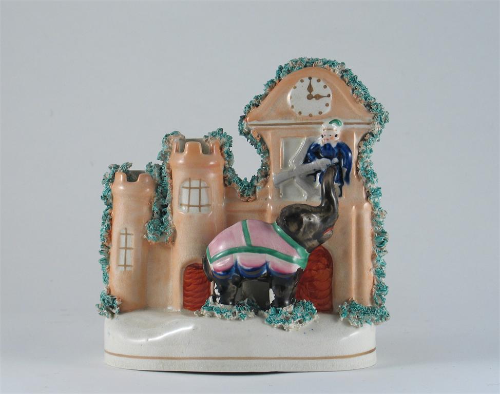 A Staffordshire model of the elephant of Siam, rescuing Mr Hemming as Prince Almansor from an upstairs window, mid 19th century, 16.5cm. Cf, Pugh, p.410.