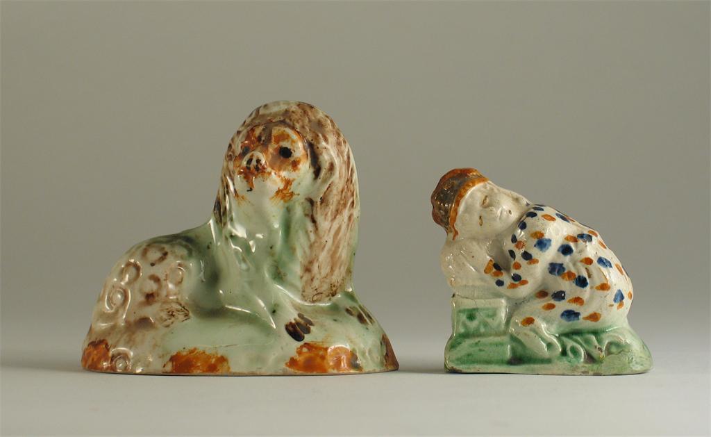 A small Prattware model of a girl at prayer or sleeping, 18th/19th century, and a creamware model of a lion, 9.5cm. Max. (2)