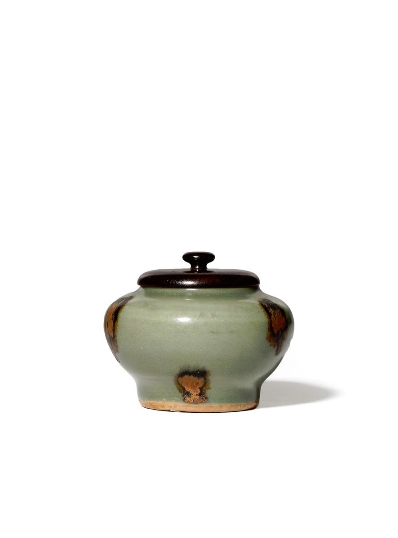 The compressed circular body decorated with irregular brown splashes, a hardwood cover, 8.8cm. (2)