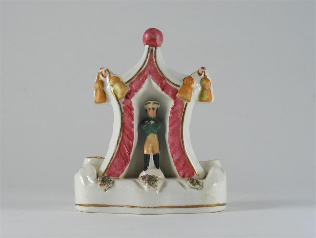A Staffordshire porcelain pen holder, modelled with Napoleon standing in a tent, mid 19th century, 13cm. Cf. Pugh, p.232.