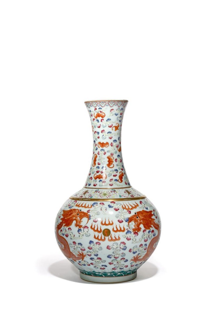 Brightly enamelled with two scaly five-clawed dragons and a flaming pearl of wisdom amongst clouds, the neck with many bats beneath a band of ruyi-heads, the shoulder with lotus and shou characters, 40.5cm.