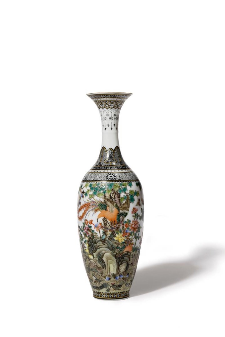 Delicately painted with a pair of phoenix and a multitude of other birds, bainiao chaofeng, all amongst flowering peony and rockwork with pine and maple trees, the flared neckrim painted with formal leaves and geometric bands, the base inscribed Jeng de Zhen yi shu ci chang chu pin, 16cm.