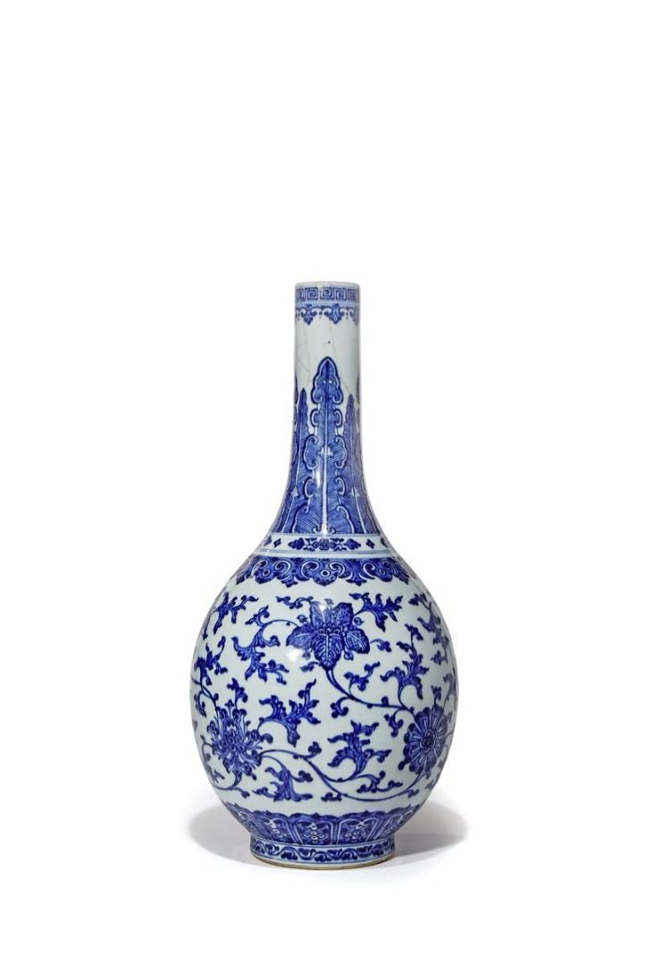 A CHINESE BLUE AND WHITE BOTTLE VASE SIX CHARACTER QIANLONG SEAL MARK AND OF THE PERIOD 1736-95...