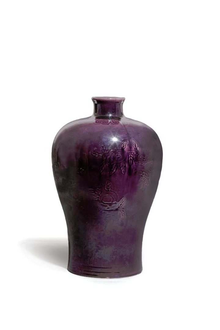 The tapering body decorated with the Three Abundances, sandou, with fruiting sprays of finger citron, peach and pomegranate, a band of lappets to the shoulder, decorated all over in a rich purple glaze, 29.5cm.