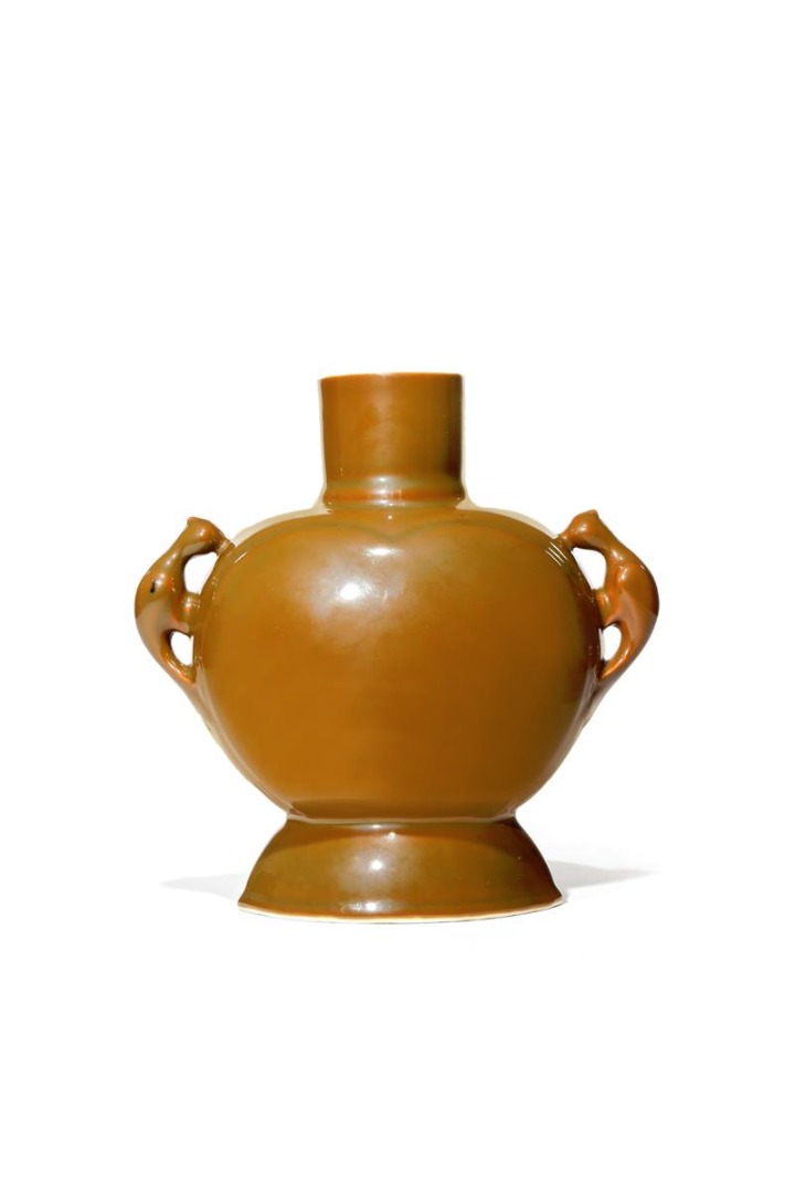 The ovoid body with a cylindrical neck, moulded to each side with a peach-shaped panel, all raised on a domed elliptical foot, with two handles formed as birds to the shoulder, decorated with a rich brown glaze, 22.3cm.