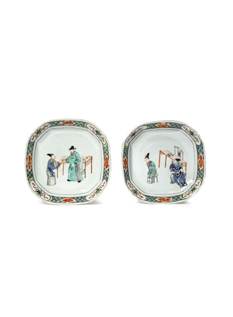 A PAIR OF CHINESE OCTAGONAL FAMILLE VERTE DISHES KANGXI 1662-1722 One depicting a gentleman...