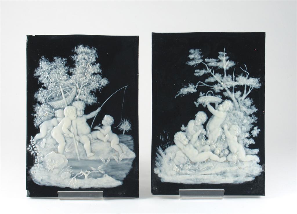 A pair of pte sur pte plaques, decorated with scenes of cherubs fishing and eating grapes, incised monograms, 2nd half 19th century. Small chips. 25cm. (2)