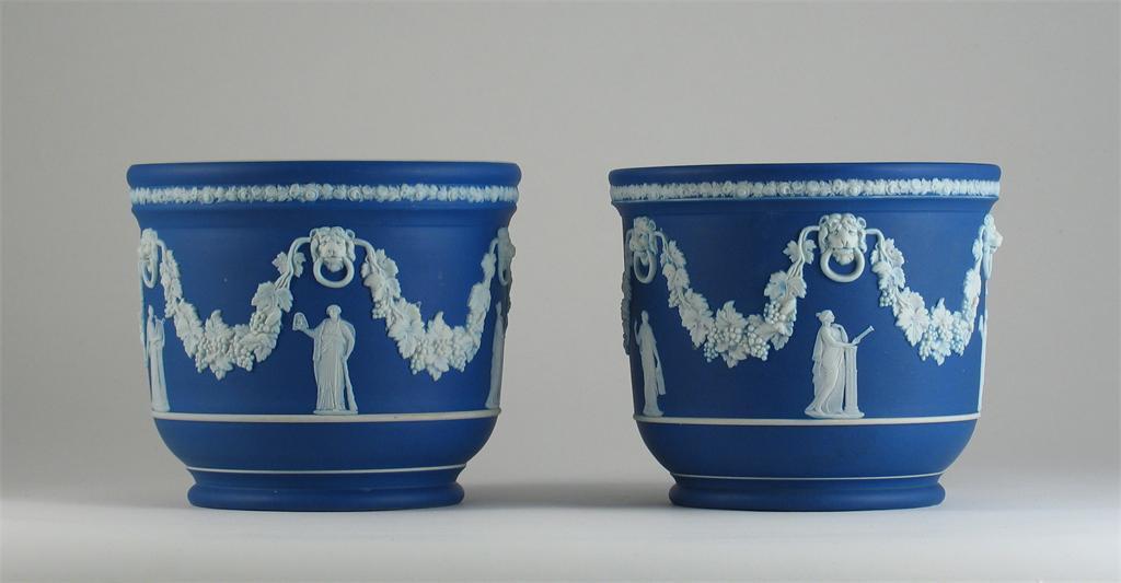 A pair of Wedgwood blue Jasperware cachepot, applied with classical reliefs, 'Wedgwood' impressed, 19th century, 15.5cm. (2)
